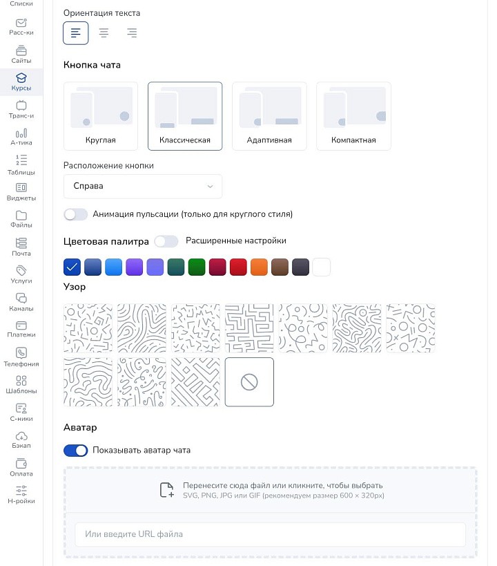 Далее укажите ориентацию текста, дизайн кнопки чата, ее расположение, цвет, узор и аватар.