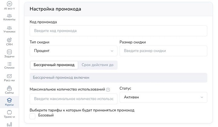 Когда все укажете, сохраните и перейдите на предпросмотр в промостранице. Теперь, если при покупке обучения ученик введет промокод, цена изменится.