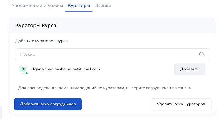 Затем в верхнем меню во вкладке «кураторы» прикрепите кураторов, выбрав их из списка сотрудников. Назначенные наставники будут отвечать за проверку домашних заданий и общение с учениками.
