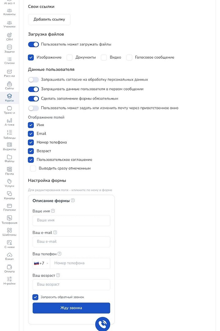 А еще можно разрешить пользователям загружать файлы, запрашивать у них контактные данные, включать пользовательское соглашение и прикреплять собственные ссылки.