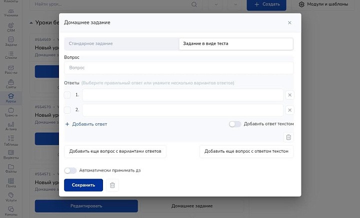 Здесь же прикрепите домашние задания: стандартные или в виде теста. В первом случае введите название, текст и ответ. Можно прикреплять файлы и тесты, отмечать необязательные упражнения.