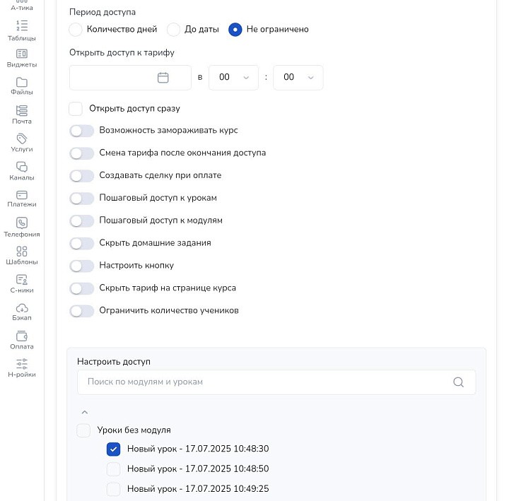 В дополнительных настройках выберите тип доступа — мгновенный или пошаговый. Это удобно, если по условиям программы занятия открываются, к примеру, на следующий день или только после выполнения ДЗ.