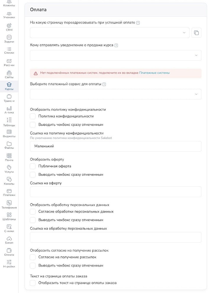 Сначала перейдите в «платежи» в левом меню и привяжите платежную систему, при помощи которой принимаете деньги.