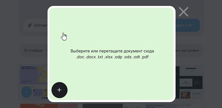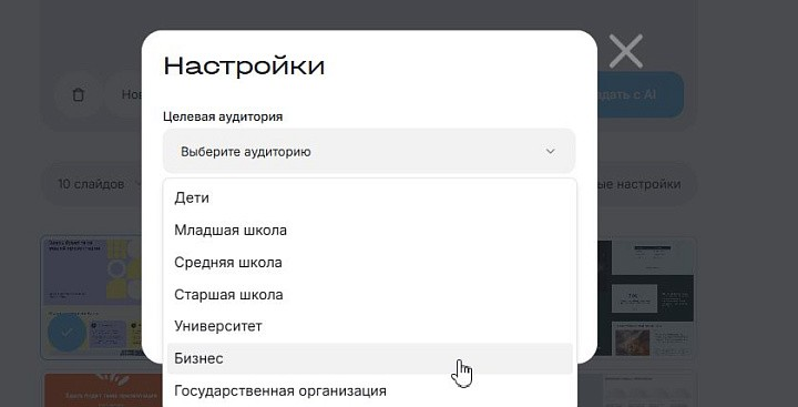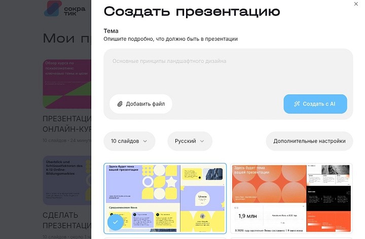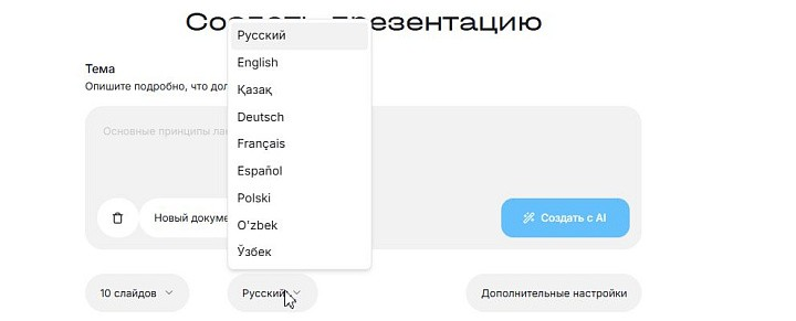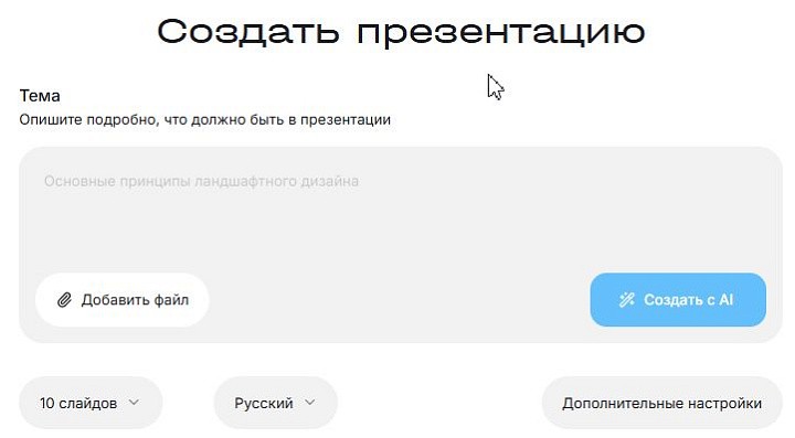 Можно указать тему, количество слайдов, язык и выбрать дизайн, или прикрепить файл и написать, кто целевая аудитория.