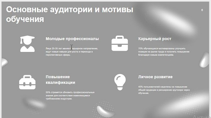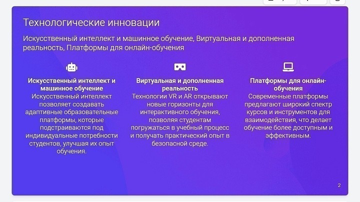 SlidesGPT выделил больше тенденций: развитие искусственного интеллекта и машинного обучения, виртуальной и дополненной реальности, платформ для онлайн-обучения, а также рост интереса к гибким форматам обучения и некоторые другие.