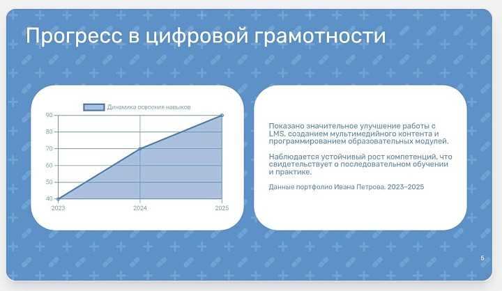 Но здесь нужна внимательная и тщательная проработка слайдов. Мы добавили в ИИ портфолио в виде текста. Но он изменил текст, который превратился в рассказ от третьего лица. Для портфолио это не подходит.