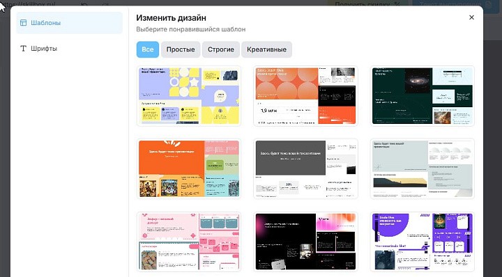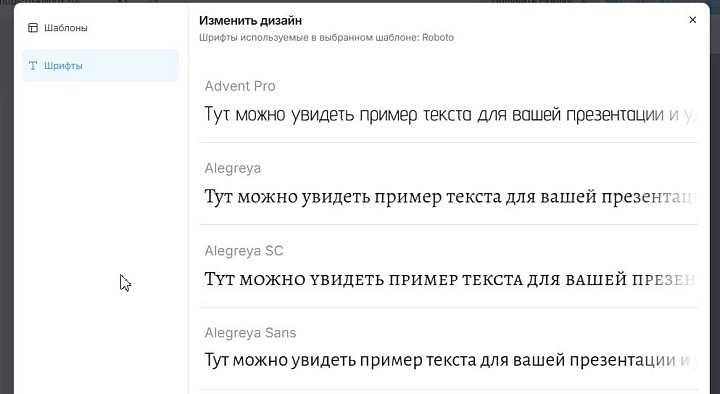 В этой же вкладке можно изменить шрифт. Сервис покажет, какой в шаблоне сейчас, и предложит другие варианты.