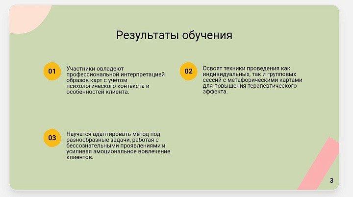 Отправили ИИ ссылку на обучающую программу о метафорических картах и попросили сделать слайды для целевой аудитории. Он добавил лишнее: об истории метафорических карт и их видах, исследованиях, при этом не разместил данные о программе и авторе. Мы удалили из плана теорию и попросили дополнить недостающие данные. С этим сервис справился, а еще дополнил слайды иллюстрациями и диаграммами.