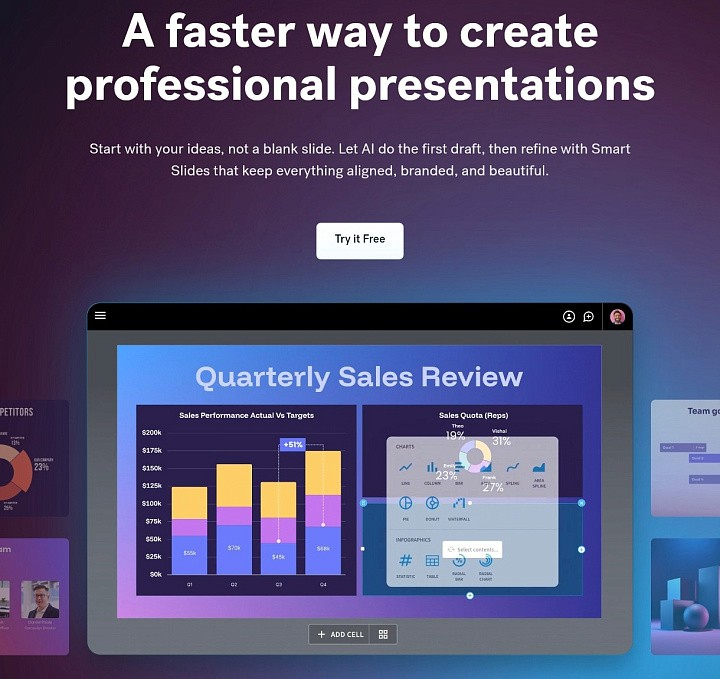 Онлайн-сервис для создания презентаций с элементами искусственного интеллекта (ИИ), который помогает автоматизировать дизайн и компоновку слайдов. Текст, графики и картинки нужно добавлять самостоятельно.