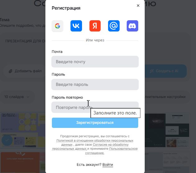 Нажмите «Создать с AI». Вы окажетесь на странице регистрации: чтобы сделать первую работу, нужен аккаунт.