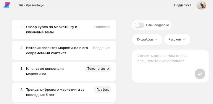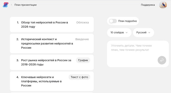 Сервис соберет структуру, а вы при необходимости ее отредактируете — добавляйте или удаляйте слайды вручную.