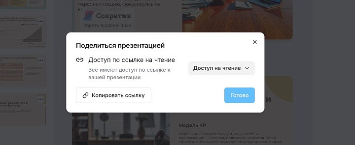 Поделиться. Открывайте доступ для чтения коллегам, заказчикам или ученикам. Человек, у которого будет ссылка, сможет посмотреть материал на компьютере или телефоне без регистрации.