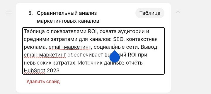 Можно удалить или заменить слайд, добавить детали, запросить более подробный план.