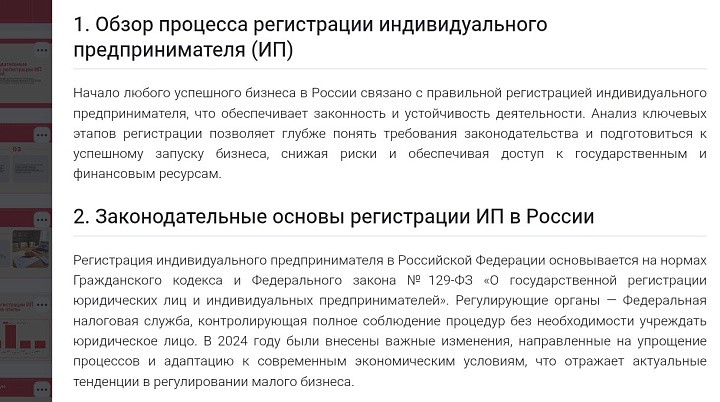 Сервис создал яркую презентацию, в которой учел нормы законодательства, нашел статистические данные, свежие цифры по лимитам для ИП. Но важно помнить, что нормативная база постоянно обновляется и нужно проверять, все ли нейросеть правильно написала.