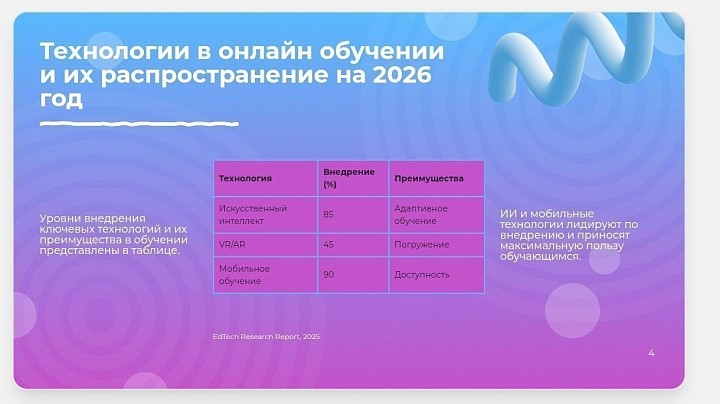На заданную тему буквально за минуту сделал слайды без ошибок. Выделил тенденции онлайн-образования: развитие ИИ, VR, мобильного и микрообучения. Добавил отсылки к исследованиям, из которых брал данные.