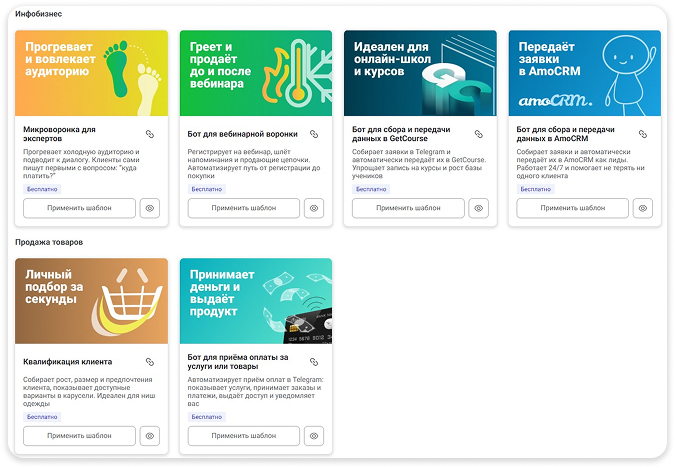 Для тех, кто впервые создает воронку продаж, на платформе есть специальные шаблоны:
