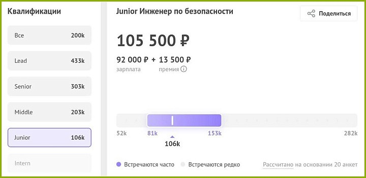 Спрос на рынке труда: высокий. Все из-за того, что сейчас проходит цифровизация бизнеса и растут число и сложность кибератак. Так, с января по июнь 2025 года их стало на 27% больше и достигло 63 тысяч, делится статистикой RED Security SOC [5].