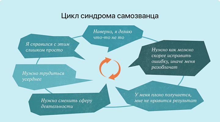 Синдром самозванца — это психологическое явление, при котором человек сомневается в своей компетентности, несмотря на реальные успехи. Он чувствует, что не заслуживает признания, боится, что окружающие «поймут, что он на самом деле ничего не знает» и приписывает достижения внешним факторам: везению, помощи других, «удачному стечению обстоятельств».