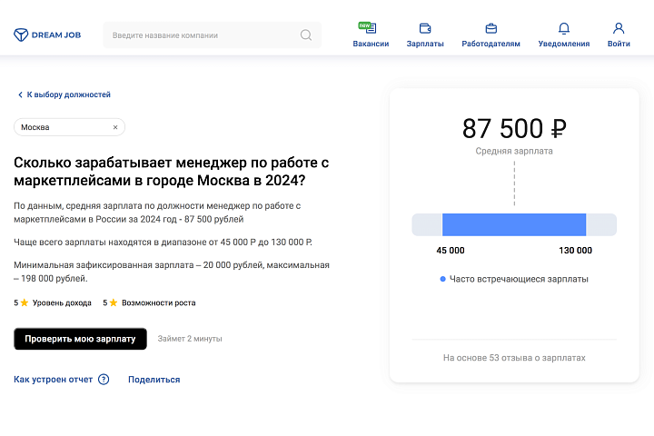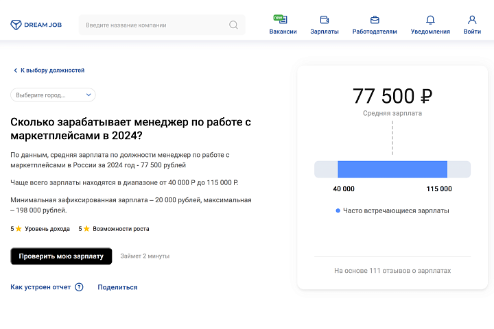 Средний оклад специалиста в России по состоянию на 2024 год составляет 77 500 ₽ — по данным Dream Job: