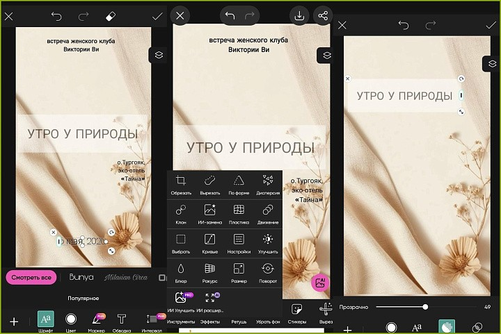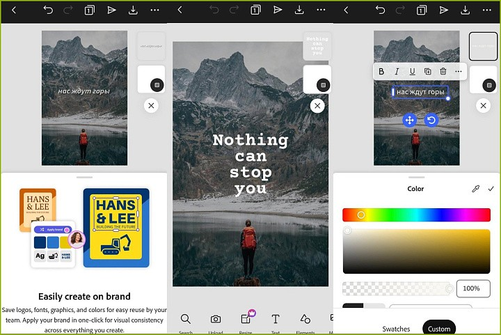 Для создания контента «на ходу» — с телефона или планшета — идеально подойдет мобильное приложение Adobe Express. Через мини-редактор можно загрузить корпоративные элементы, стилизовать описание через эффекты или улучшить его через нейросеть.