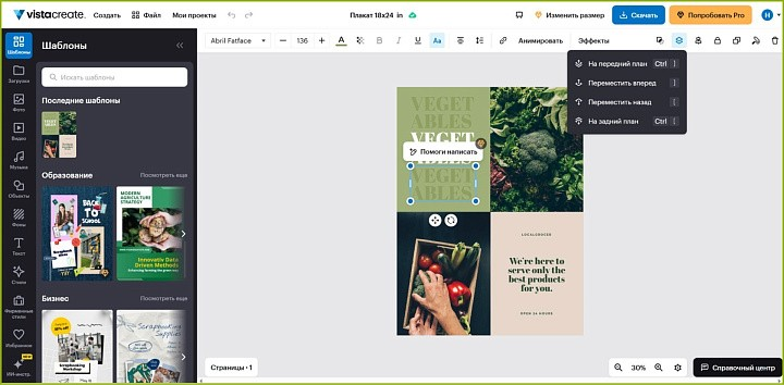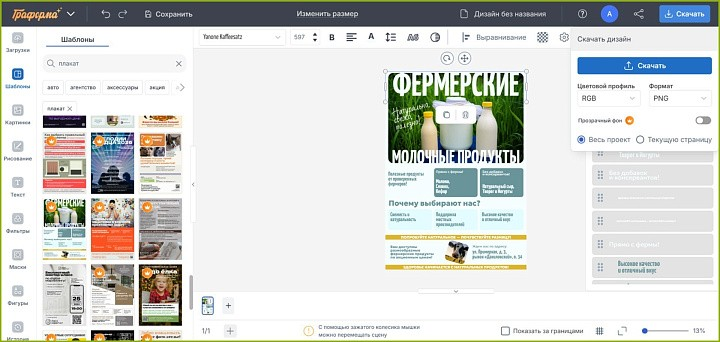 Отечественный веб-конструктор предлагает стильные бизнес-шаблоны для плакатов и постеров. В «Граформе» есть базовый функционал для улучшения качества иллюстрации — подбор температуры, оттенка и контрастности, а также удаление фона через алгоритмы ИИ.
