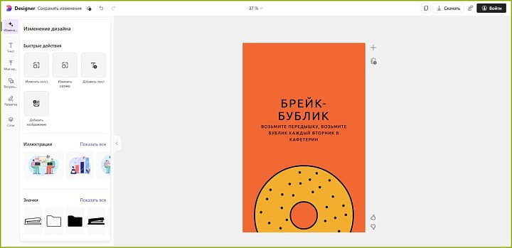 На сайте есть небольшая коллекция элементов, которая включает тематические фото, иконки, фигуры. Если пользователю нужен конкретный значок или изображение, он может воспользоваться нейросетью. Алгоритмы ИИ не только генерируют иллюстрации и текст, но и весь холст целиком. Для этого нужно написать название работы в поле промта и указать размеры листа. Чтобы воспользоваться всеми опциями, в том числе умными и инструментами, понадобится активная учетная запись в Microsoft.