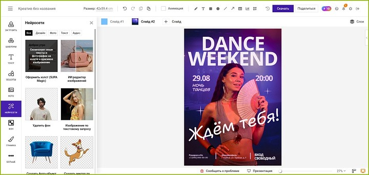 Онлайн-приложение для создания постеров с библиотекой стильных заготовок, фотографий, дизайн-элементов и векторных рисунков. Если в каталоге сервиса нет подходящей иллюстрации, пользователь может сгенерировать новую картинку при помощи нейросети.