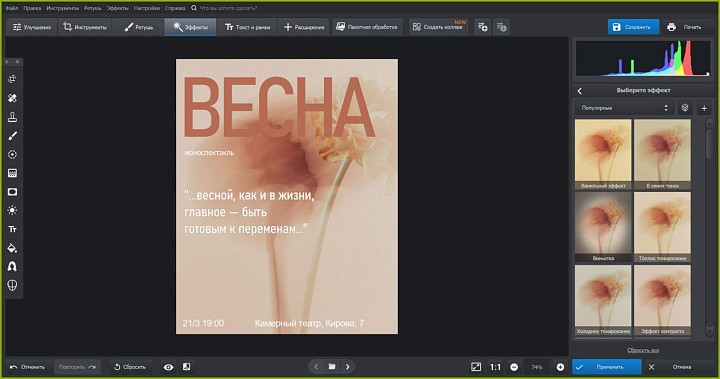 Многофункциональное приложение для создания афиш. Пользователь может исправить искажения в цветопередаче и яркости при помощи кривых, исправить пластику и геометрию, добавить резкости и размытия конкретному участку. В каталоге представлен хороший выбор художественных кистей с мазками в виде звезд и фигур, фото можно обработать в стиле потрепанной бумаги, сделать пиксельную поверхность, добавить шум. На официальном сайте есть много креативных дизайн-макетов для открыток, календарей, пригласительных.