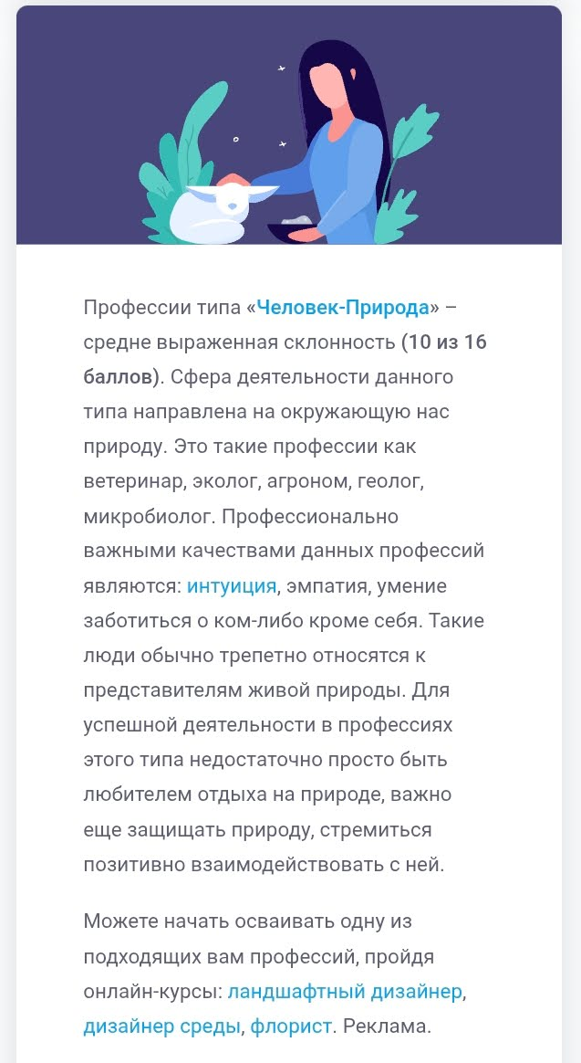 Поймете, какую работу выбрать и в каких востребованных направлениях вас ждет успех. В методике сорок профессий из девяти областей — от программирования до медицины. В процессе оцениваются предпочтения и способности. После прохождения перейдете в telegram-бота. Там посоветуют, какую деятельность выбрать, поделятся инструкциями и лайфхаками, а еще предложат пройти курсы и пообщаться с консультантом. Он подскажет, что подойдет под ваш образ жизни и закроет карьерные цели.