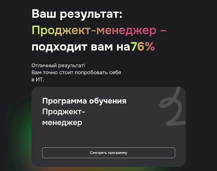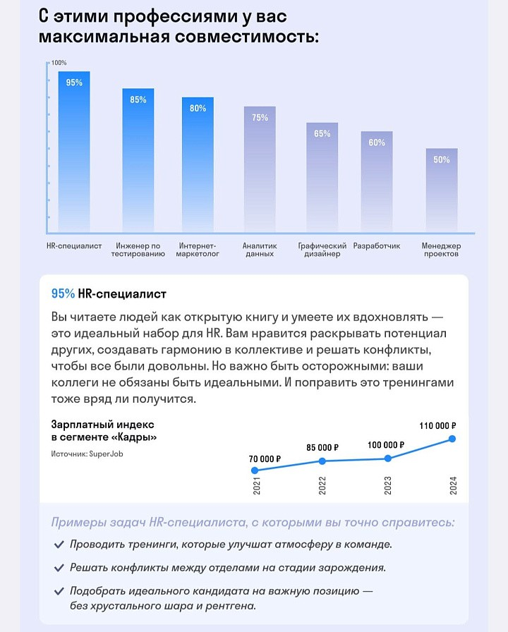 Определите склонности, увлечения и умения с учетом современных трендов. Задания составили так, чтобы выявить способности к аналитике, креативу и управлению. У вас будет отчет: тип личности, плюсы и точки роста, описание идеальной работы, три специальности: обязанности и доход. Потом можно записаться на встречу с HR. Он подскажет, на какие качества опираться и как прокачать навыки.
