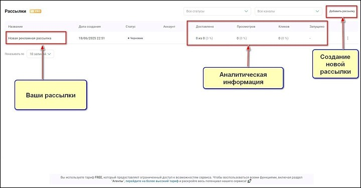 Здесь вы можете создавать рассылки разных типов и отправлять их персонально пользователю или сразу группе людей. Инструмент доступен только в платных тарифах. В разделе вы сможете создавать рассылки, просматривать уже имеющиеся, сортировать, а также получать аналитику: сколько сообщений было доставлено и просмотрено, сколько кликов по ссылкам в них было сделано. Это позволит вам понять, эффективна ли рассылка или ее стоит доработать, чтобы улучшить результаты.