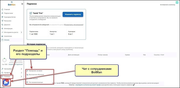 В разделе «Помощь» вы можете заказать настройку бота, пройти бесплатное обучение, а также найдете базу с текстовыми инструкциями и сможете перейти к чату взаимопомощи. Ниже находится кнопка чат, кликнув по которой, вы сможете написать сотрудникам конструктора.