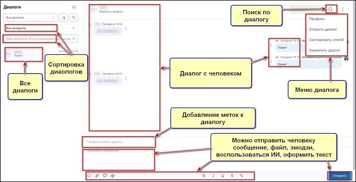 В разделе «Диалоги» вы найдете все переписки бота с пользователями, когда-либо его запустившими. Вы можете их прочитать, отсортировать диалоги по имени человека, username или ID, последнему сообщению. Открыв беседу, вы сможете добавить к ней метку или вмешаться в разговор, написать человеку от своего имени через интерфейс бота, отправить файл, эмодзи, воспользоваться ИИ-помощником. Реализован поиск по сообщениям, диалог можно закрепить или открепить, а также закрыть его.