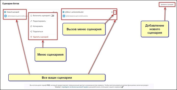 В этом разделе вы найдете все ваши сценарии ботов, сможете добавить новый, а также отредактировать, скопировать, включить или удалить имеющиеся сценарии, а также поделиться ими с другими пользователями.
