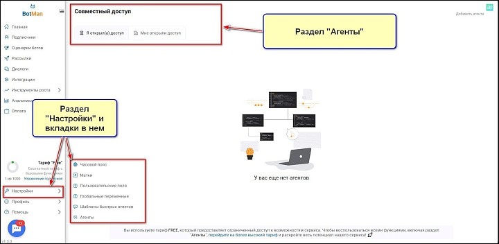 В настройках можно изменить часовой пояс, работать с пользовательскими метками и полями, глобальными переменными, настроить шаблоны быстрых агентов, а также подключить агентов – ваших сотрудников, которые будут работать с ботом.