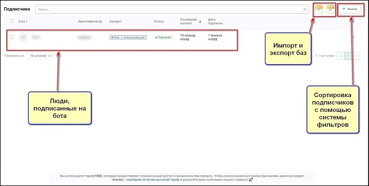 Раздел «Подписчики». Здесь можно посмотреть всех подписчиков, подключившихся к вашему боту или автоворонке, экспортировать или импортировать базы. Есть ряд фильтров для удобной сортировки пользователей.
