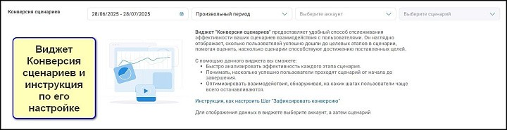 Тут же вы найдете виджет «Конверсия сценариев», который поможет вам отслеживать эффективность ваших сценариев при взаимодействии бота с пользователями. Вы увидите, сколько пользователей доходят до конца сценария, проанализируете эффективность каждого его этапа и сможете понять, как оптимизировать сценарий, чтобы он давал лучший результат.