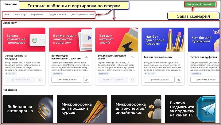 В разделе «Инструменты роста» вы найдете две вкладки. Одна из них – это «Шаблоны чат-ботов». Здесь вы найдете готовые варианты сценариев для таких сфер, как услуги, инфобизнес, продажи товаров, соцсети и т.д. Отсюда же вы сможете заказать новый сценарий.