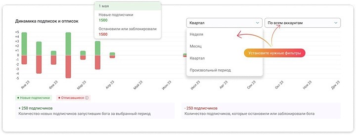 В разделе «Аналитика» вы найдете информацию о пользователях, подписанных на вашего бота. Здесь можно посмотреть, сколько человек добавилось за определенный отрезок времени, отписалось, остановило или заблокировало бота.
