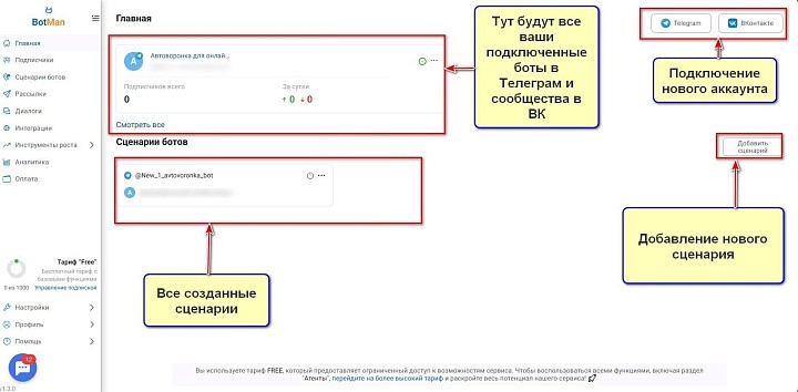 Бесплатный тариф «Free» доступен сразу после регистрации. На нем вы получаете базовые возможности, позволяющие вам изучить конструктор и научиться создавать простых ботов и автоворонки.