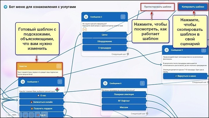 большой выбор шаблонов ботов и автоворонок: вы можете воспользоваться ими, подправить под себя и получить готового бота или автоворонку, не тратя на их создание много времени;