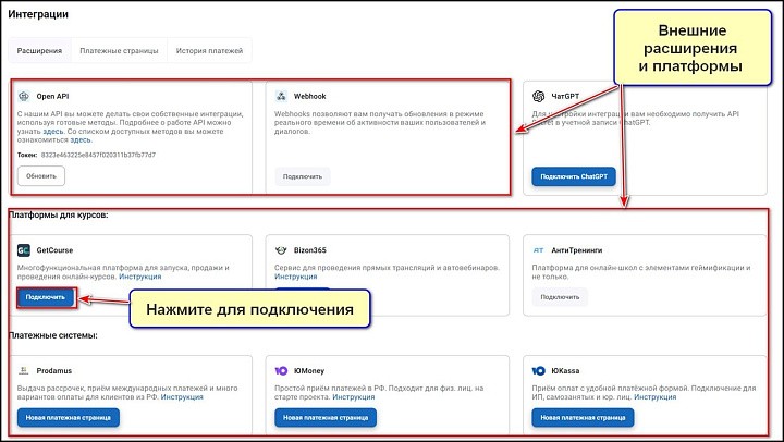 В этом разделе вы сможете подключить внешние расширения и платформы (для курсов, системы CRM и получения платежей, рекламные сервисы, телефонию). Чтобы начать работу, нужно кликнуть по кнопке «Подключить» в окошке платформы, а далее следовать инструкциям на экране.