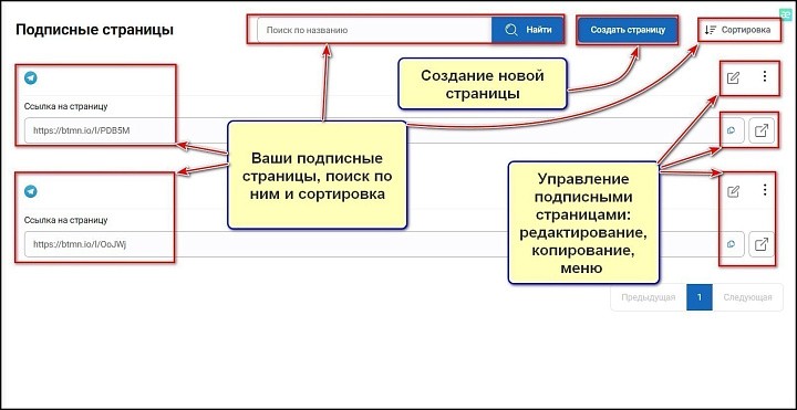 В этой вкладке, второй в разделе «Инструменты роста», вы можете создавать подписные страницы – одностраничные сайты, обычно предназначающиеся для сбора пользовательских данных, подписки на свои ресурсы, рассылки и т.д. Здесь вы сможете просмотреть имеющиеся подписные страницы, скопировать их, отредактировать или удалить, поделиться и т.д., а также создавать новые.