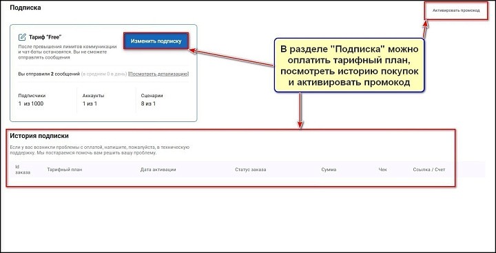 Во вкладке «Оплата» вы сможете оформить подписку и посмотреть историю оплаты тарифных планов, а также активировать промокод.