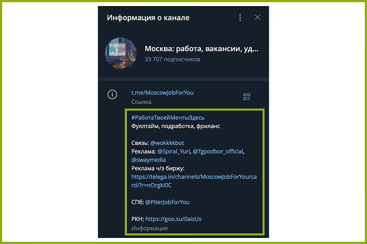 Канал с 33 000+ подписчиков, публикует вакансии в Москве и агрессивно монетизирует контент.
