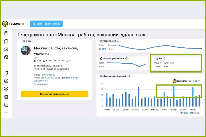 Канал с 33 000+ подписчиков, публикует вакансии в Москве и агрессивно монетизирует контент.