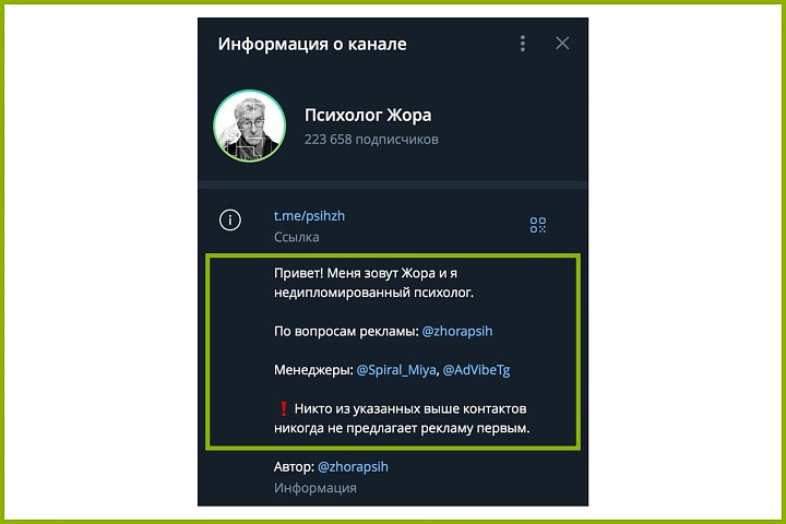 Не перегруженное описание канала. Приветствие, легкая самоирония, контакты администраторов и предупреждение, чтобы подписчики не доверяли мошенникам.