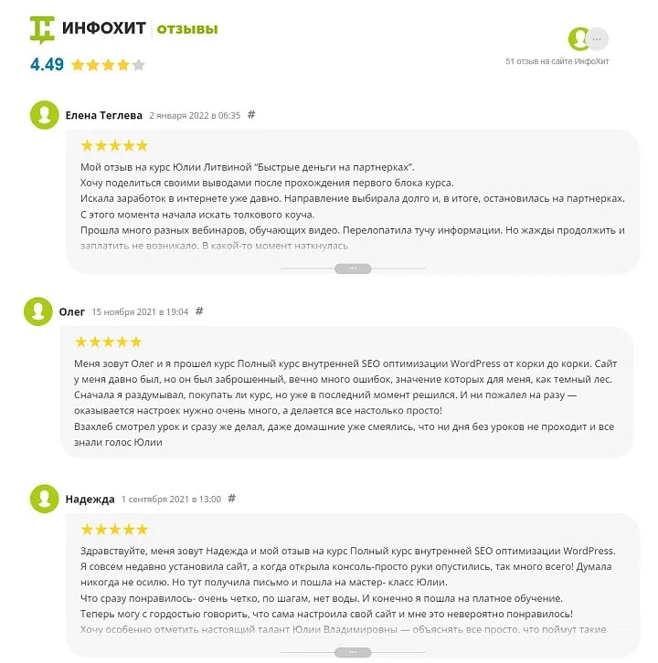 На агрегаторе «ИнфоХит» автоматически появляется то, что пишут в «Яндексе», Getcourse и iRecommend. Потенциальные студенты знакомятся с комментариями в одном месте. Это усиливает доверие к преподавателям, которых там размещают, и посетители принимают обоснованные решения об обучении. Поэтому страницы с оценками самые посещаемые.
