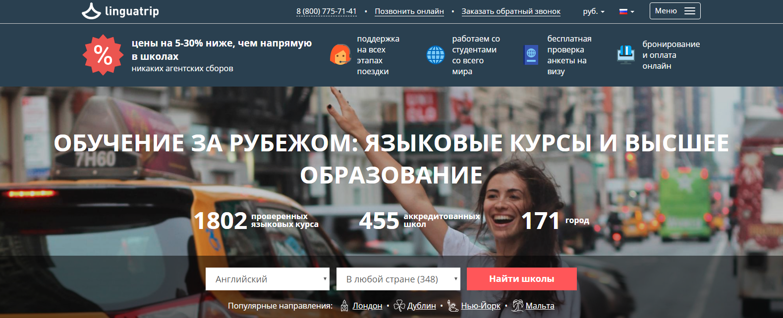 Онлайн-проект LinguaTrip — это сервис по поиску курсов иностранных языков за пределами России. Ежемесячно свыше 100 тысяч студентов используют этот ресурс для поиска курсов по английскому языку и прохождению практики непосредственно в Англии, США, Мальте и других странах.