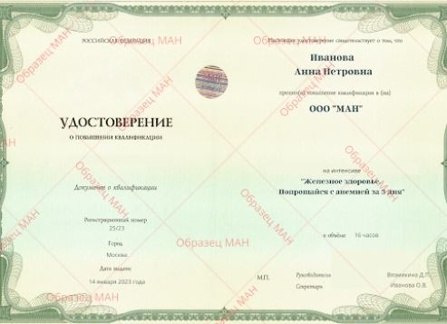 По окончании интенсива специалисты получат удостоверение о повышении квалификации, которое подтвердит их знания и компетенции в работе с анемией. Это удостоверение будет внесено в государственный реестр и поможет повысить ценность специалиста на рынке труда.